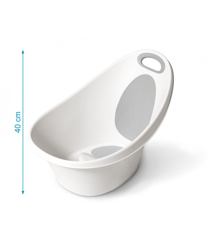 Banheira com encosto com um design ergonómico que se adapta de forma inteligente ao crescimento do seu bebé. Desde o nascimento até aos 6 meses de idade, o bebé fica reclinado, encostado ao apoio lombar de forma segura.